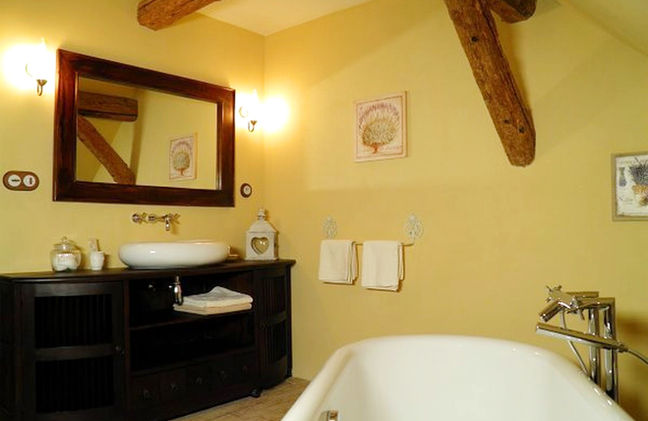 Prostorný dvoulůžkový pokoj Business nabízí pohodlí díky velké ložnici s manželkou postelí, pracovní stolkem, komodou, dále předsíňkou s odkládacím koutkem a krásnou koupelnou, kde se nachází vana uprostřed místnosti, toaleta s bidetem a odkládací plochou na kosmetiku.